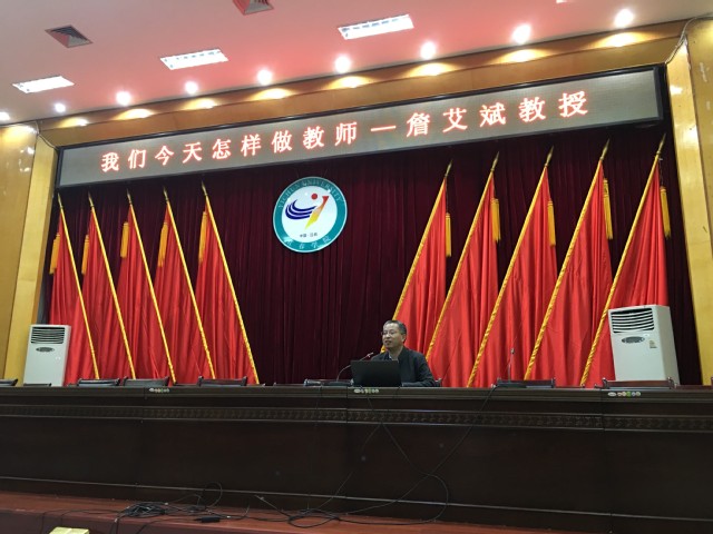 4月19日上午9点30,江西师范大学文学院院长、博士生导师詹艾斌应邀出席我校“汉语言文学专业2021年实践教学周暨教育见习动员会”,并给在座师生带来一场名为《我们今天怎样做教师》的精彩讲座。文学与新闻传播学院院长冷瑾、副院长黄志刚、师范教育学院副院长高建青出席,相关专业教师和学生300余人聆听了讲座。讲座由中文系主任刘旭东博士主持。