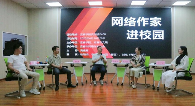 为促进文学创作教育发展,提升学生实践能力,6月18日下午,文传学院(师范教育学院)联合宜春市文联在实训楼E408举办“网络作家进校园”活动。本次活动由宜春市网络作家协会承办,文学与新闻传播学院(师范教育学院)院长高建青主持,中国作协会员、江西省作协常务理事、宜春市文联副主席欧阳娟,知名网络作家卢磊、李璟箫、刘斌应邀出席,学院师生代表100余人参加活动。