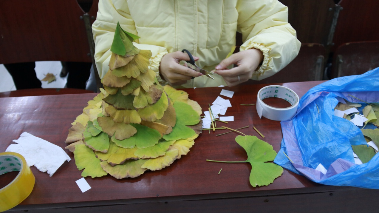 活动现场,同学们以在校园里收集的银杏叶、枫叶等落叶为创作素材,搭配胶水、彩笔、剪刀等工具,将落叶巧妙拼贴、裁剪、绘制,创作出一幅幅充满创意的作品。有的同学用落叶卷成花,有的将其堆叠成帽子,还有的进行粘贴,制作成精美的画卷。