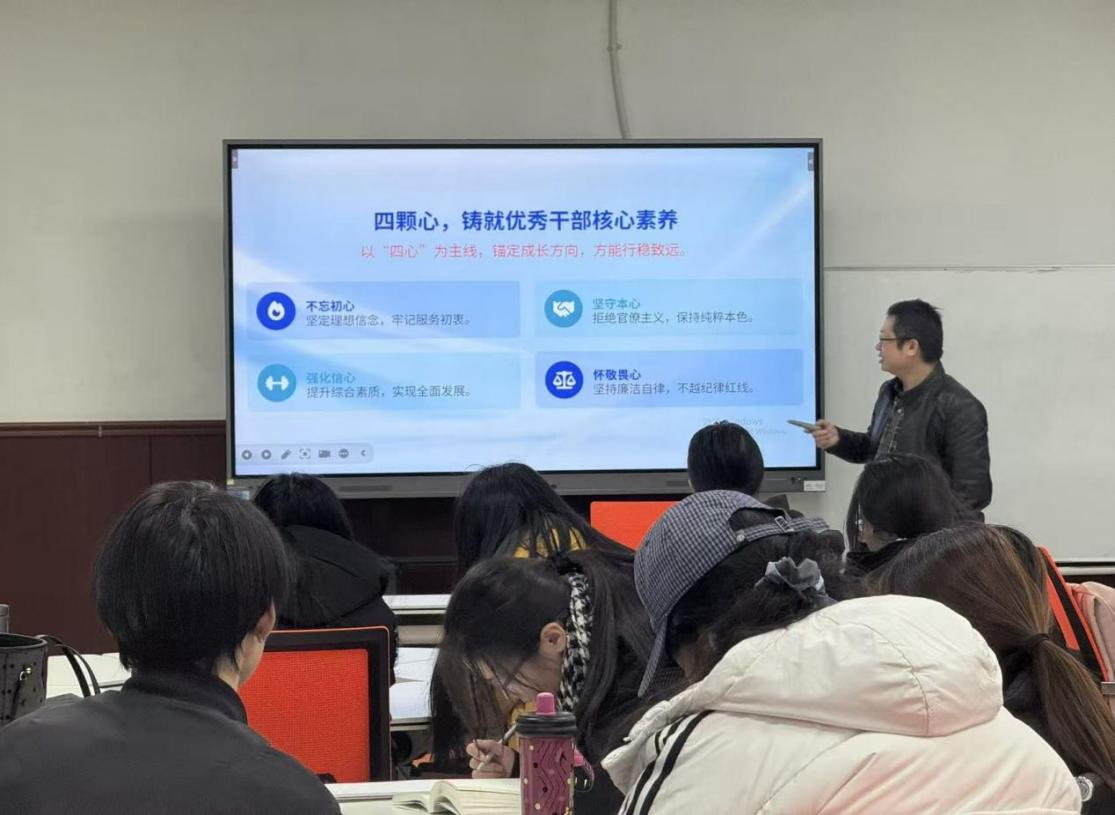 培训中,他以生动的案例切入,结合自身丰富的学生工作经验,指明一个优秀的学生干部,一定是心中有信仰、眼中有光芒的人;一定是有坚定理想信念,听党话、跟党走,把个人成长融入国家发展大局的人;一定是有理想、敢担当、能吃苦、肯奋斗的新时代好青年。他从“责任意识塑造”“沟通能力提升”“团队协作技巧”“应急处理思维”四个核心维度展开讲解,既剖析了学生干部在工作中易出现的角色定位模糊、沟通方式生硬等共性问题,又分享了实用的解决策略。 他希望学生干部能不忘初心,坚定理想信念;坚守本心,杜绝官僚主义;强化信心,提升综合素质;常怀敬畏之心,以身作则,廉洁自律。