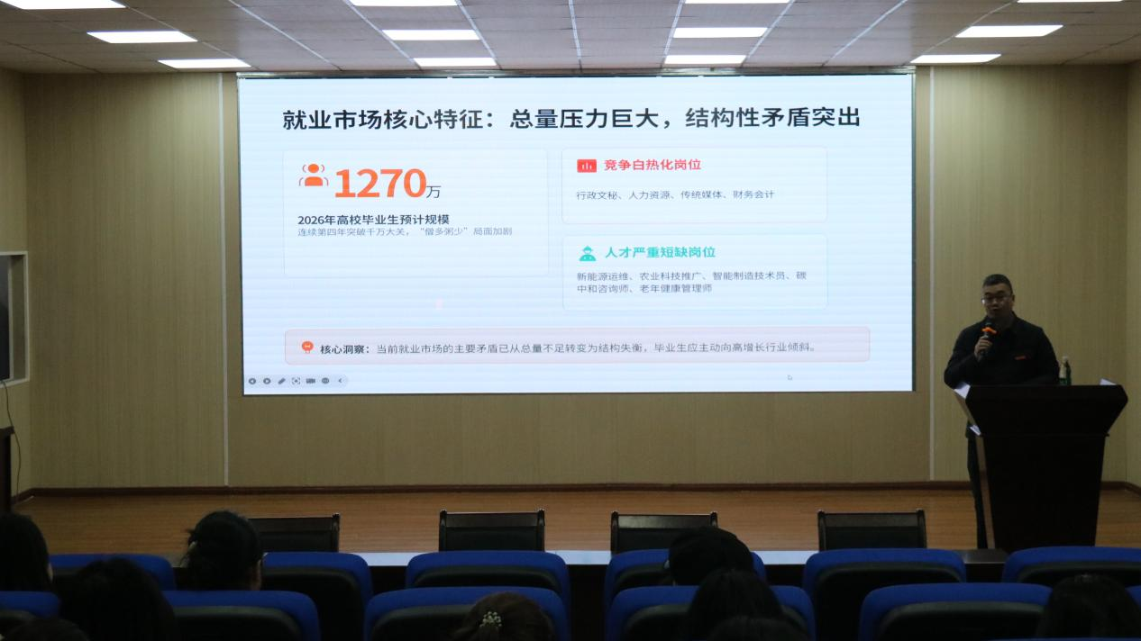 讲座中,陈路扬书记指出,2026年高校毕业生预计规模达1270万人,就业市场总量压力巨大,但核心矛盾已转向结构性失衡。他提醒毕业生,行政文秘、财务会计等岗位竞争白热化,而新能源运维、农业科技推广、智能制造技术员等新兴领域人才严重短缺,鼓励大家主动向高增长行业倾斜。