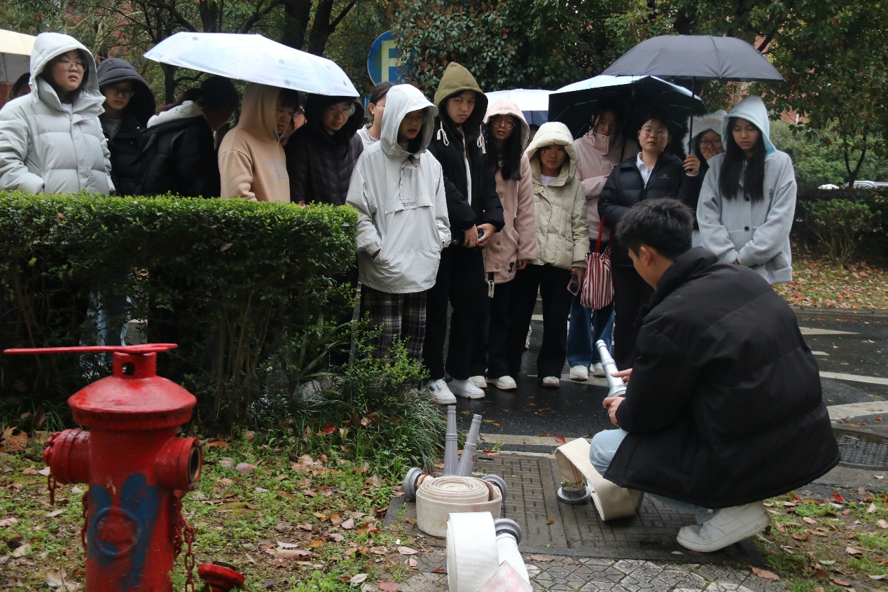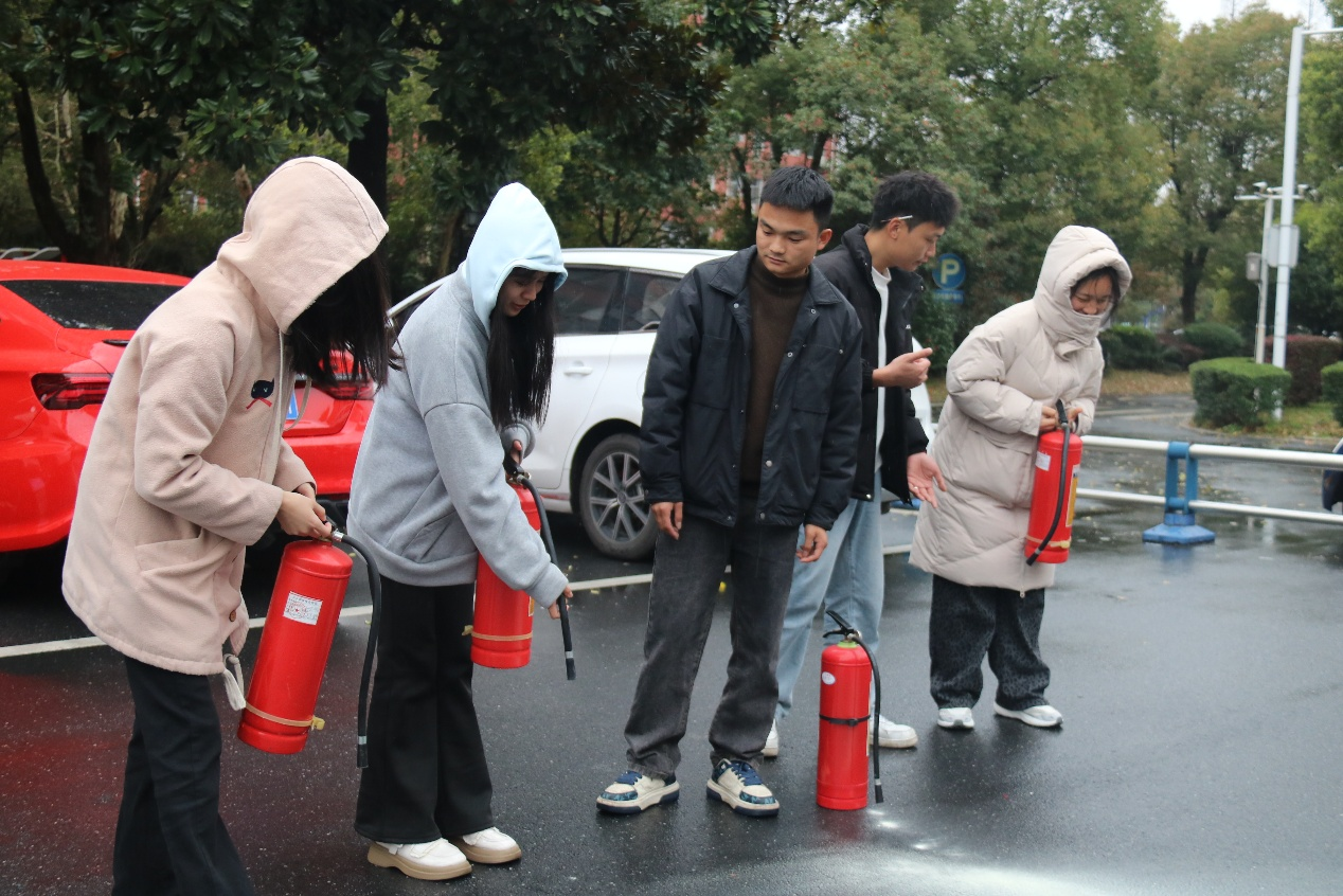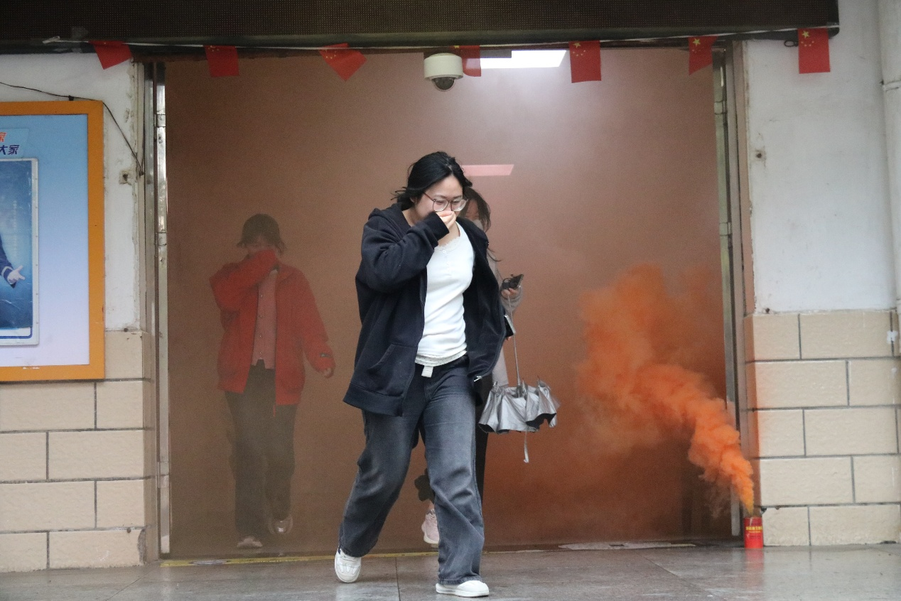 下午4点,演练正式开始。随着模拟烟雾升起,各楼层学生干部立即提醒同学迅速撤离。同学们用湿毛巾捂住口鼻,弯腰低姿,沿预定疏散路线快速、有序撤离至楼外集结区。整个过程紧张有序,反应迅速,配合默契,在数分钟内便全部安全集结于大学生活动中心前的空旷地带,展现了良好的应急素养和组织纪律性。集结完毕后,邓伟峰对本次疏散演练进行了现场总结。随后,学校保卫处工作人员详细讲解并演示了灭火器、消防水枪及防烟面罩的正确使用方法和步骤。在工作人员的指导下,同学们踊跃参与,亲自操作灭火器进行灭火体验,将理论知识转化为实战技能。